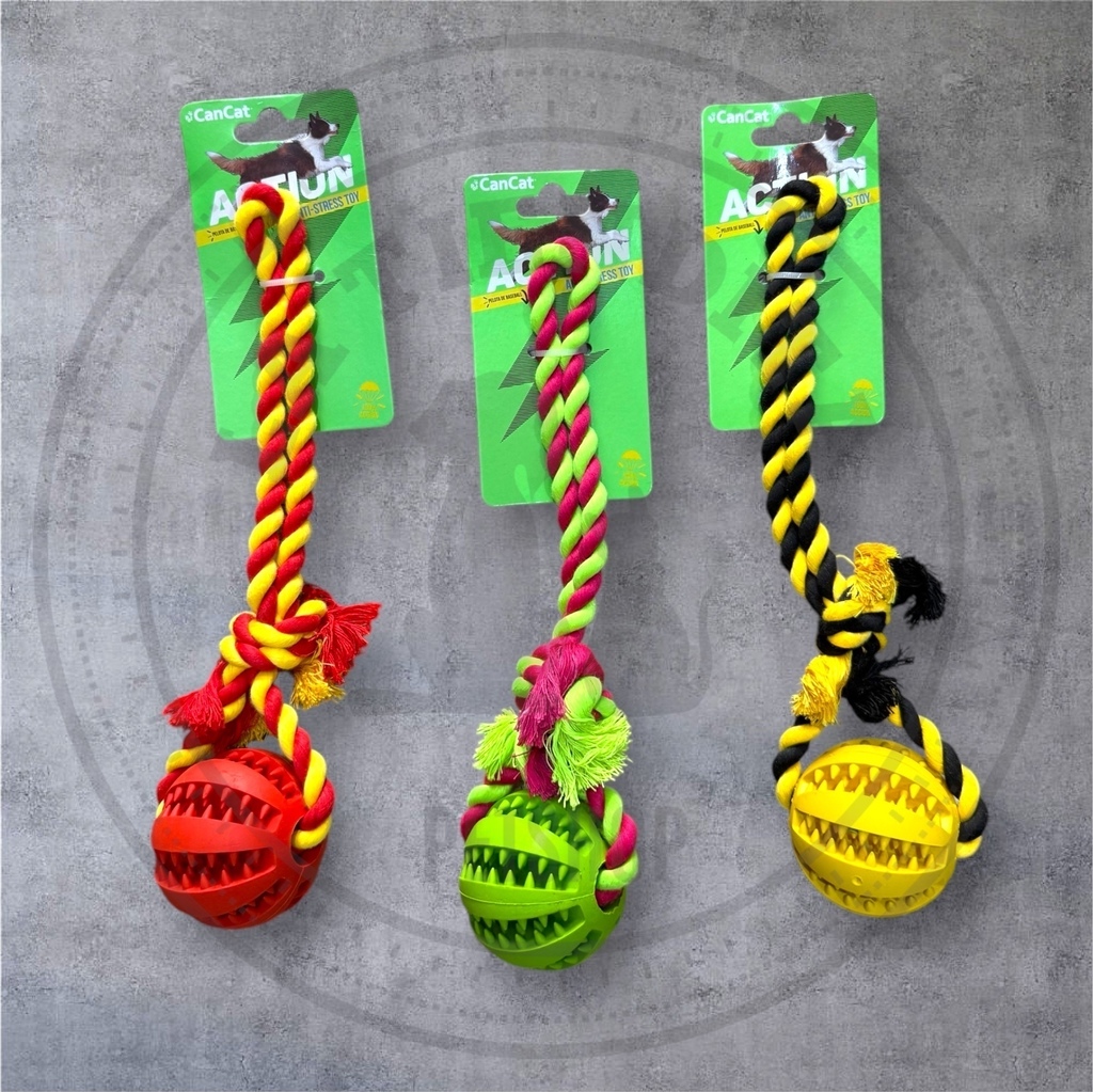 Pelota de béisbol con cuerda de algodón, caucho natural. En la pelota se le puede agregar comida balanceada o trocitos de snacks.
